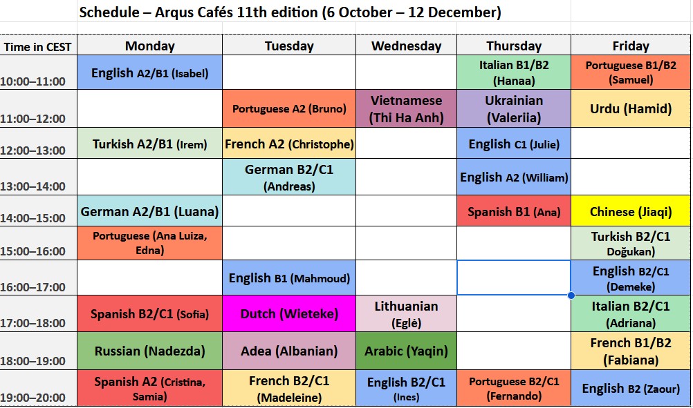 Please note: The times listed for the language cafés are Central European Time (CET). If you live in Lithuania or Ukraine, for example, the start time would be one hour later than the time listed, and if you live in Ireland or Portugal, the start time would be one hour earlier than the time listed.