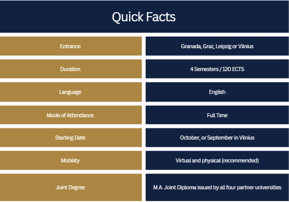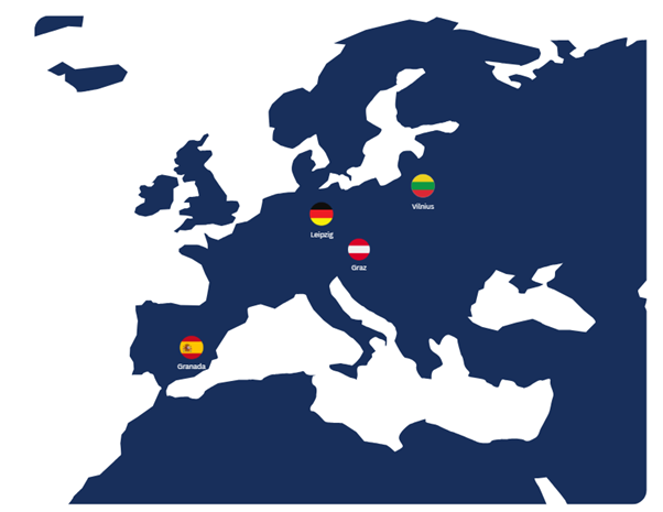 Study at four universities across Europe: Granada, Graz, Leipzig, and Vilnius. Choose an entrance university and use the opportunity to spend at least one semester at another partner university.
